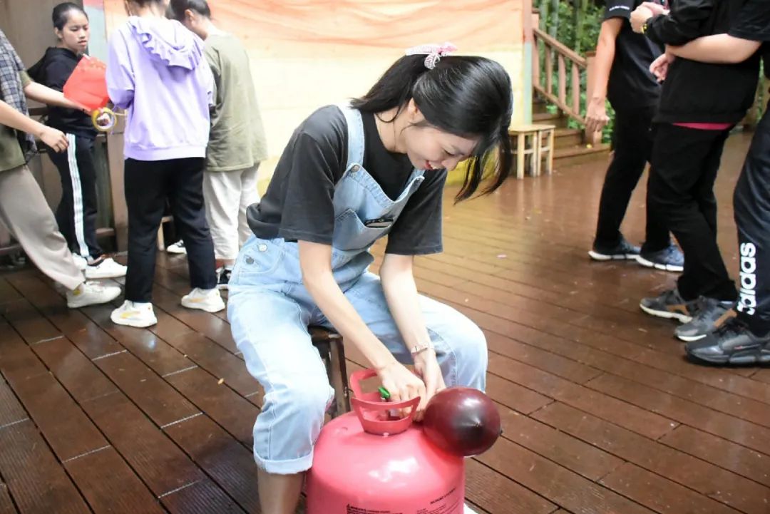 同學(xué)們隔著一米半圍成圈看著老師“危險”操作——打氫氣球,正喜悅第一個氣球終于慢慢膨脹起來了,轉(zhuǎn)眼間便搖搖擺擺地飄上了天空,引來一片唏噓,接二連三地,氣球仿佛都通了氣似的,比起被束縛,更向往無邊無際的藍天。小伙伴們只得小心翼翼地把氣球接到手上,轉(zhuǎn)圈,打結(jié),系繩,綁石頭,同學(xué)們分工合作。不一會兒,舞臺布滿了五彩斑斕的氫氣球,我們創(chuàng)造出了斑斕絢麗的舞臺,成就感油然而生。