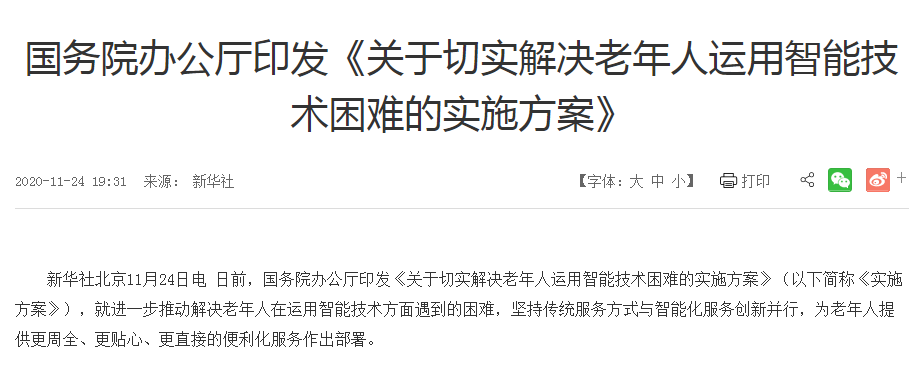 11月24日,國(guó)務(wù)院辦公廳印發(fā)了《關(guān)于切實(shí)解決老年人運(yùn)用智能技術(shù)困難實(shí)施方案》的通知,要求各類日常生活場(chǎng)景中,必須保留老年人熟悉的傳統(tǒng)服務(wù)方式。